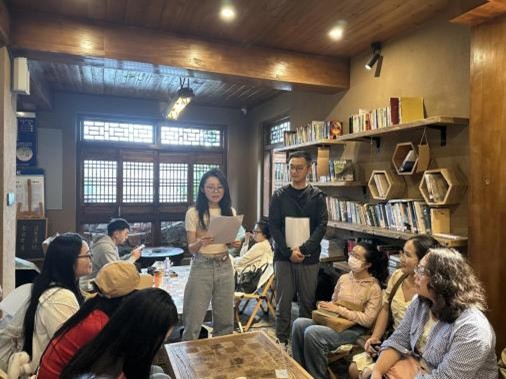 交流结束后,大家实地参观了“乐居之眼”旅居图书馆。这座图书馆巧妙保留传统“一颗印”民居格局,在四周青瓦土墙的窗棂间,精心打造出集阅读、借阅、藏书与交流于一体的文化空间。雨帘从四水归堂的天井垂落,更添几分静谧,阵阵书香萦绕其间。置身于此,青年理论学习组成员们更真切体会到旅居图书馆是如何将公共文化服务延伸至旅游场景,通过“旅居+书香”的融合,让游客沉浸式体验“有一种叫云南的生活”的独特魅力。
