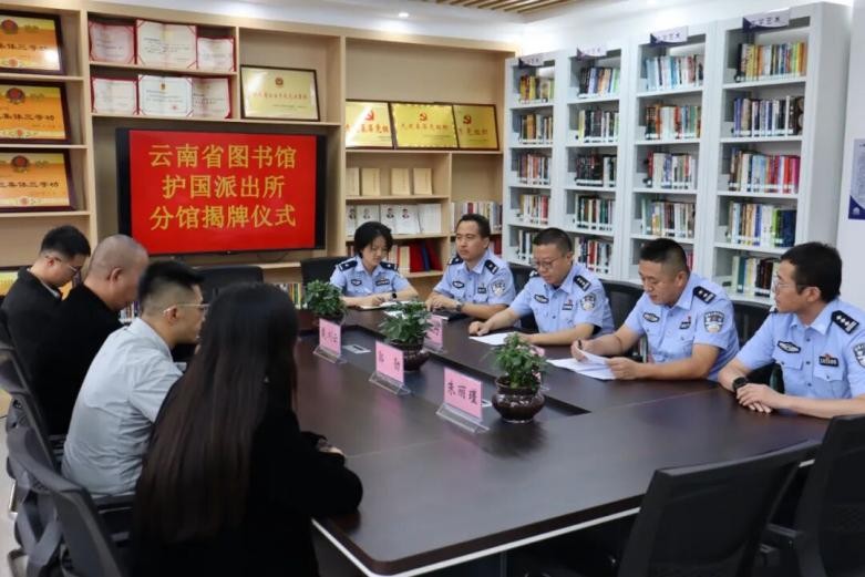 2025年9月26日,云南省图书馆护国派出所分馆揭牌仪式在昆明市南强街护国派出所举行。昆明市公安局五华分局党委委员、政工室主任彭丹,护国派出所所长张陵、民辅警代表和云南省图书馆典藏借阅部主任戴川云等相关人员参加仪式,共同见证全省公安系统首个云南省图书馆派出所图书分馆的诞生。分馆的建成,将为广大民辅警搭建知识学习平台,营造热爱阅读、崇尚读书的浓郁氛围,引领大家多读书、读好书、善读书,助力建设新时代学习型、知识型公安队伍。