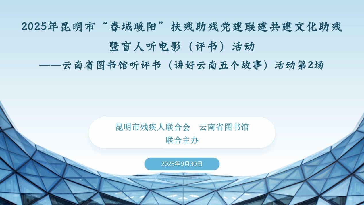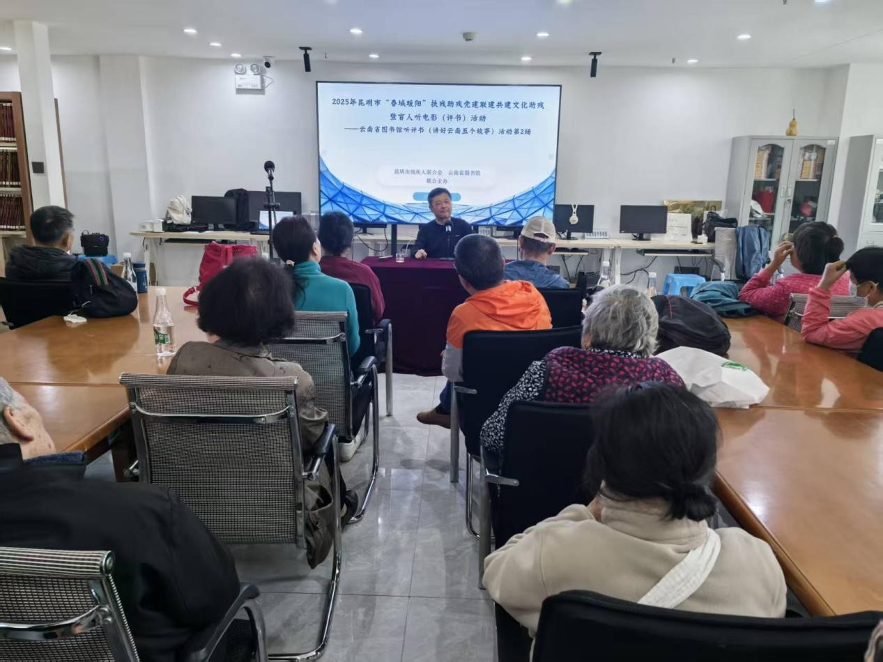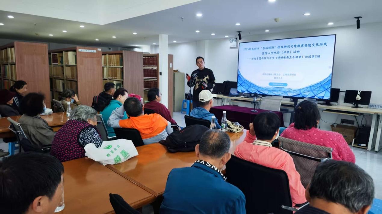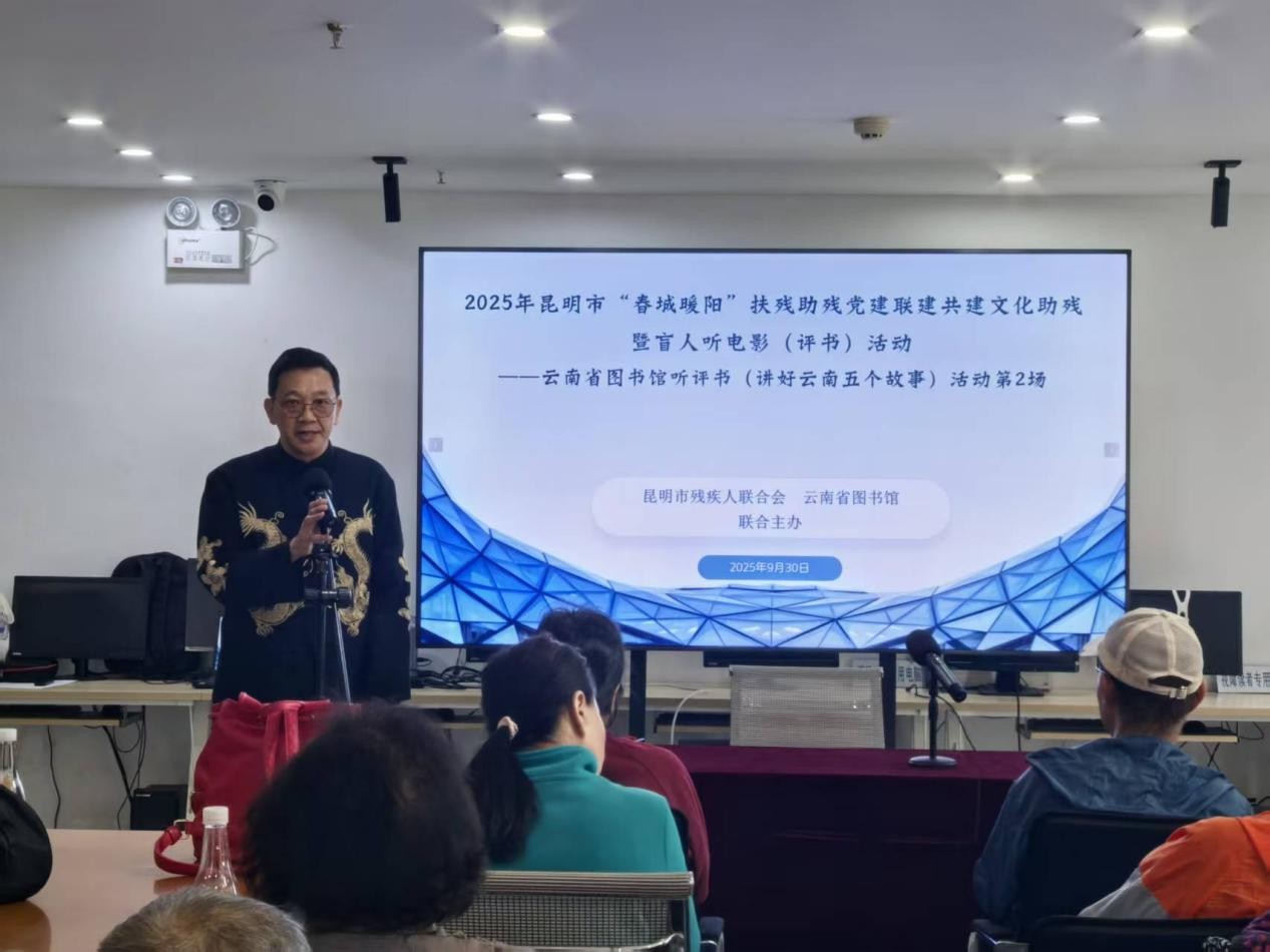 中秋国庆双节临近,为丰富视障群体精神文化生活,传承红色基因与中华优秀传统文化,9月30日下午,昆明市残疾人联合会与云南省图书馆联合举办的2025年昆明市“春城暖阳”文化助残暨“盲人听电影(评书)”系列活动第二场评书专场活动在云南省图书馆视障阅览室暖心启幕,50位视障朋友及陪护人员共享了一场兼具文化温度与节日氛围的视听盛宴。