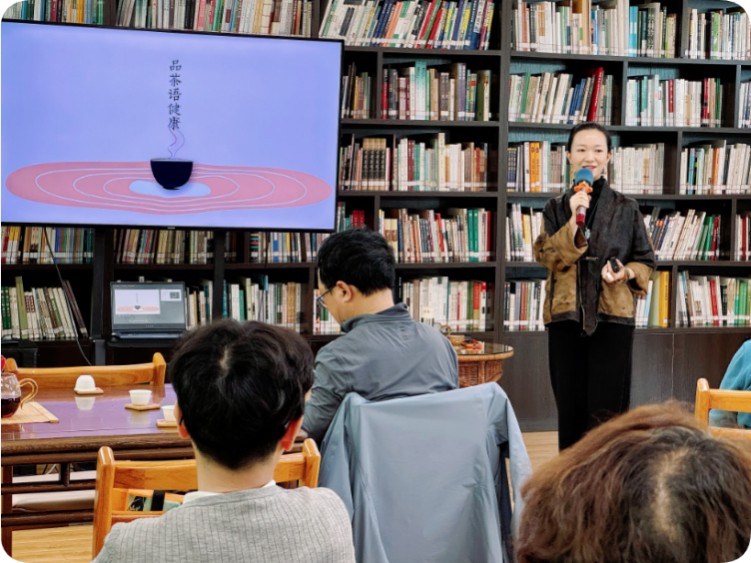10 月 28 日下午,一场以“品茶语健康”为主题的老年人专场活动在云南省图书馆五楼“普洱茶文化图书馆”举行。活动邀请国家一级茶艺技师、国家二级评茶师、国家高级公共营养师谭佩主讲,远在千里之外的国家图书馆的老年读者朋友通过云南省图书馆微信视频号直播方式参听。谭老师围绕老年群体需求与季节特点,从重阳节风物习俗切入,结合秋季养生要点,与老年读者朋友们分享了茶叶知识、喝茶养生、科学饮茶等相关知识。活动现场气氛温馨融洽,老年读者朋友们一边品茶,一边听讲,不时拿出手机记录下课件片段知识,不时就心中疑问与谭老师进行交流互动。在一个多小时的品茶聆听中,老年读者朋友们切实地感受着中国茶文化的独特魅力与养生价值。