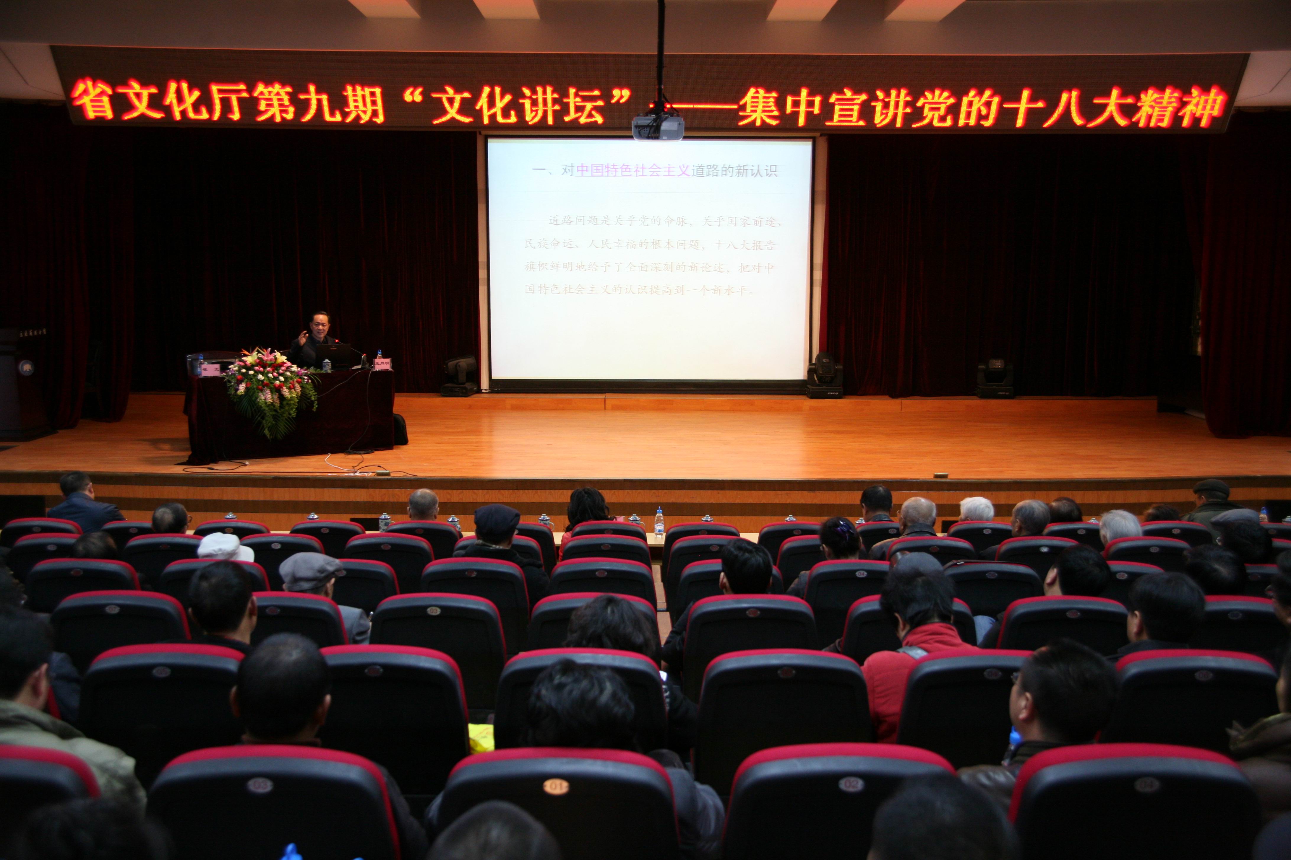 12月24日下午,云南省文化厅第九期文化讲坛在我馆举行,主题是集中宣讲党的十八大精神。讲座由云南省文化厅党组成员、副厅长崔文主持。中国人民大学教授王向明作了题为《新认识,新阐述,新要求——学习领会党的十八大报告精神》的演讲。省文化厅全体公务员,厅直属各单位基层党组织负责人、中层以上领导干部、副高以上专业技术人员,省直文化系统副处级以上离退休干部参加了讲座。