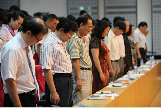 图为比赛现场全体人员向鲁甸地震遇难人员默哀