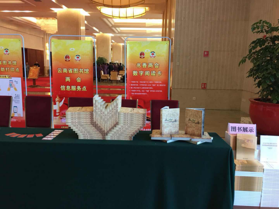 在做好数字化阅读服务的同时,云南省图书馆与春晓图书经贸有限公司专门在“两会”会场大厅设置了“党的十九大”论著专题展区,展示了《之江新语》、《习近平的七年知青岁月》、《以习近平同志为核心的党中央治国理政新理念新思想新战略》、《十九大代表风采录》等书籍,并将《卫我中华一脉同 云南少数民族抗战纪实》一书免费赠送参会代表和委员。云南省图书馆还专门收集整理了《昭通作家》、《昭通文学发展道路初探》等一些具有地方特色的本土作家著作免费赠送代表、委员阅读。