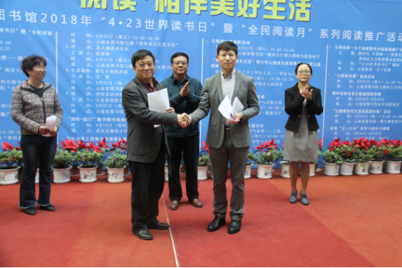 4月20日,在云南省图书馆2018年“4•23世界读书日”暨“全民阅读月”系列阅读推广活动启动仪式上,云南省图书馆馆长王水乔分别与云南大学图书馆馆长李东红、云南师范大学图书馆副馆长王顺英交换了“云南省图书馆联盟”建设协议书。这标志着“云南省图书馆联盟”建设项目正式启动。