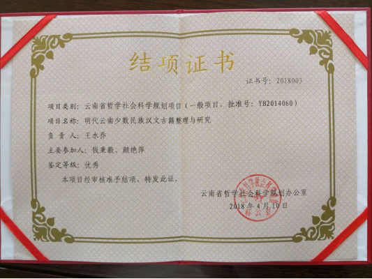 近日,以云南省图书馆馆长王水乔为主持人,历史文献部钱秉毅、颜艳萍为成员的云南省哲学社会科学规划项目“明代云南少数民族汉文古籍整理与研究”,经专家评审鉴定,顺利结项,获评优秀。