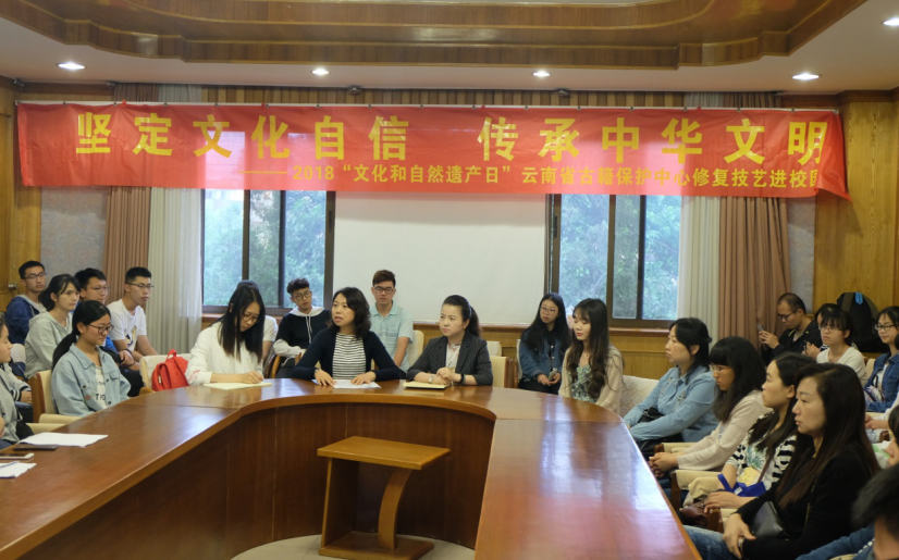每年6月的第二个星期六是我国“文化和自然遗产日”。为进一步宣传古籍保护工作,推广古籍修复技艺,传承弘扬中华优秀传统文化,根据国家古籍保护中心相关通知精神,云南省图书馆暨省古籍保护中心携手云南大学历史与档案学院,于6月9日上午在云南大学科技馆举办了“坚定文化自信、传承中华文明——云南省古籍保护中心修复技艺进校园”活动。云南省古籍保护中心办公室负责人及古籍修复师,以及云南大学历史与档案学院60余名研究生、本科生参加了活动。