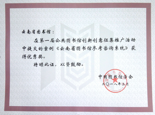 近日,“云南省图书馆参考咨询系统”在中国图书馆学会“创新引领未来——第一届公共图书馆创新创意征集推广活动”中荣获优秀奖。