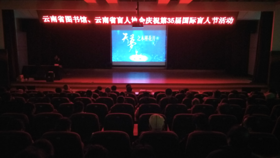 10月30日下午,云南省图书馆联合省盲协在省图书馆无障碍电影放映厅举办第35届国际盲人节庆祝活动,由昆明兴目影院创始人、首席讲述人周权为来自省内各地的盲协主席、盲童及本地盲人读者近200人现场口述无障碍公益励志电影《天梦》。