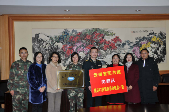 2019新春伊始,云南省图书馆与中国人民解放军驻滇某部合作设立全民阅读示范点授牌仪式暨“数字图书馆推广工程进军营”资源赠送活动在云南省图书馆举行。