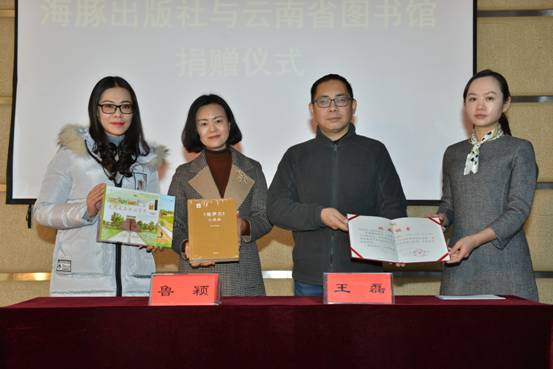 论坛上,北京海豚出版社向云南省图书馆捐赠了图书200册。(会展中心)