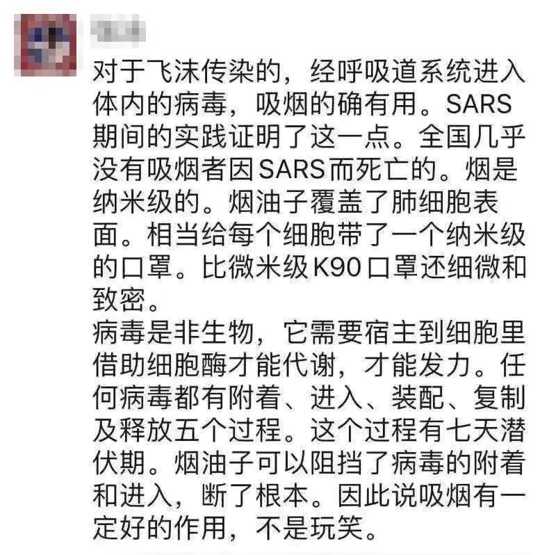 1月20日,一张朋友圈截图广为流传,截图文字称,SARS期间,全国几乎没有吸烟者因SARS而死亡。烟是纳米级的,烟油子覆盖了肺细胞表面,相当给每个细胞带了一个人纳米级的口罩,比微米级K90口罩还细微和致密,可以阻挡病毒的附着和进入,断了根本。因此说吸烟有一定的作用,不是开玩笑。