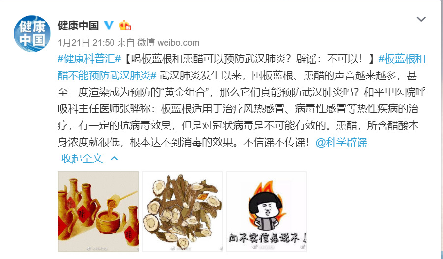 真相:国家卫健委官方微博@健康中国表示,和平里医院呼吸科主任医师张骅称:板蓝根适用于治疗风热感冒、病毒性感冒等热性疾病的治疗,有一定的抗病毒效果,但是对冠状病毒是不可能有效的。熏醋,所含醋酸本身浓度就很低,根本达不到消毒的效果。