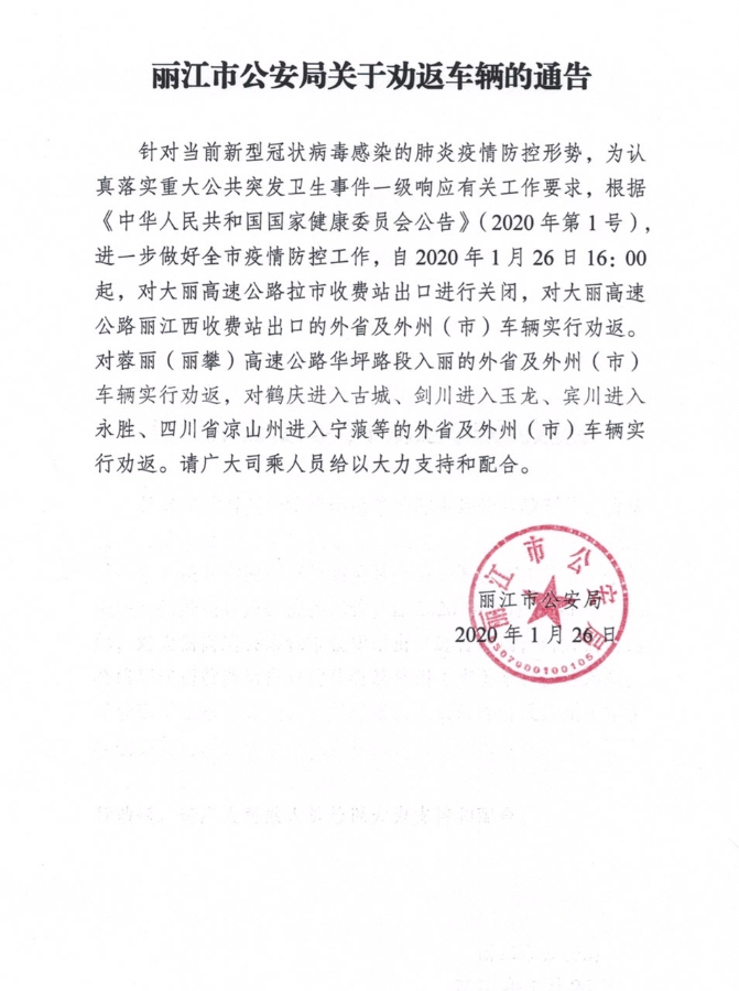 云南网讯(记者 李亚芬)1月26日,记者从丽江市公安局关于劝返外省及外州市车辆的通告中获悉,针对当前新型冠状病毒感染的肺炎疫情防控形势,进一步做好丽江市疫情防控工作,自2020年1月26日16:00起,对大丽高速公路拉市收费站出口进行关闭,对大丽高速公路丽江西收费站出口的外省及外州(市)车辆实行劝返。对蓉丽(丽攀)高速公路华坪路段入丽的外省及外州(市)车辆实行劝返,对鹤庆进入古城、剑川进入玉龙、宾川进入永胜、四川省凉山州进入宁蒗等的外省及外州(市)车辆实行劝返。