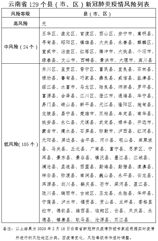 云南省129个县(市、区)新冠肺炎疫情风险列表