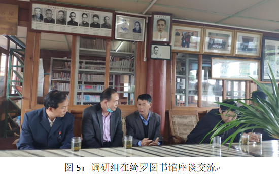 随后,调研组深入“全国最美基层图书馆”——绮罗图书馆考察调研并座谈交流。马云川馆长转达了云南省文化和旅游厅巡视员马迎春对绮罗图书馆的寄语和问候,表示在今后的工作中,云南省图书馆将积极为绮罗图书馆提供力所能及的帮助和支持,希望绮罗图书馆能历久弥新,弘扬一代代图书管理员志愿服务、传承文明的精神。
