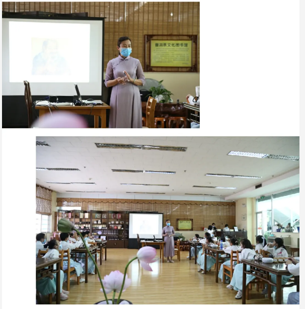 这些来参加学习的小朋友在云南省图书馆研究馆员、高级茶艺师的指导下,从观察茶叶标本开始,了解中国茶叶的发现和利用起源,认识了“茶圣”陆羽和世界上最早的茶叶专著《茶经》,诵读了著名的茶诗,学习如何辨识六大茶类,认识茶具,学习茶礼,然后亲自体验了茶叶冲泡流程,并为自己的爸爸、妈妈奉上了自己泡的茶。