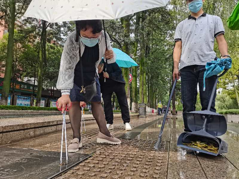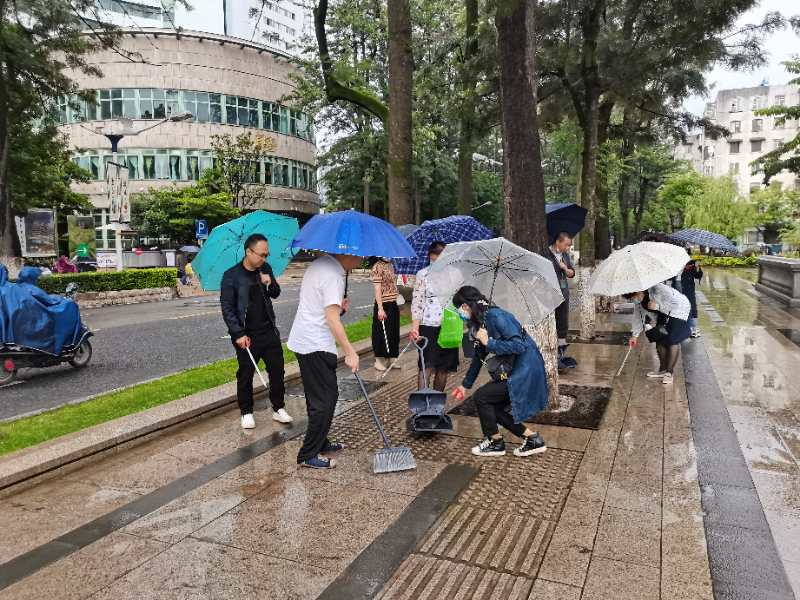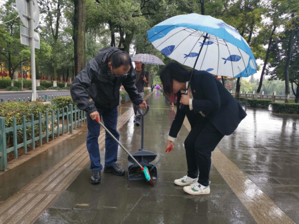 参加活动的人员分成两组,由我馆副馆长周宇青、朱庆华分别带队,从两个方向沿着我馆至翠湖路段进行大扫除。尽管当天上午天降大雨,但是参加活动的党员同志和志愿服务人员依旧热情高涨,大家冒着雨,手拿扫帚、撮箕、火钳、垃圾袋等工具,对翠湖周边相关区域内纸屑、烟头等垃圾进行了全面清理并作了垃圾分类处理,做到了全覆盖、无遗漏、零死角。