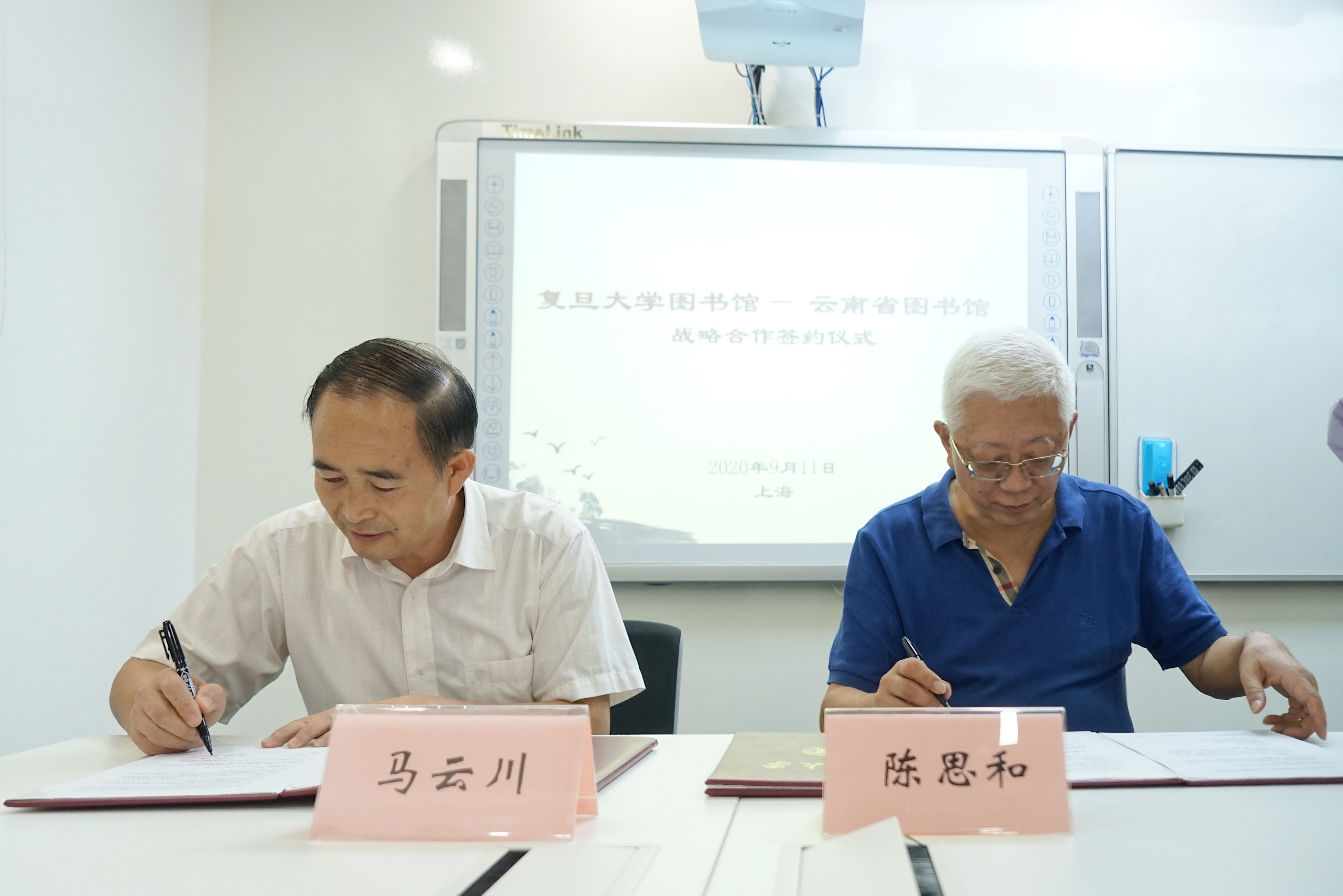 2020年9月11日,云南省图书馆与复旦大学图书馆在上海举行战略合作签约仪式。云南省图书馆馆长、省古籍保护中心主任马云川与复旦大学图书馆馆长陈思和共同签署了《复旦大学图书馆-云南省图书馆战略合作协议》。复旦大学图书馆党委书记候力强、副馆长杨光辉等领导和专家,以及云南省古籍保护中心副主任计思诚、国家级古籍修复专家杨利群等相关人员参加会议。